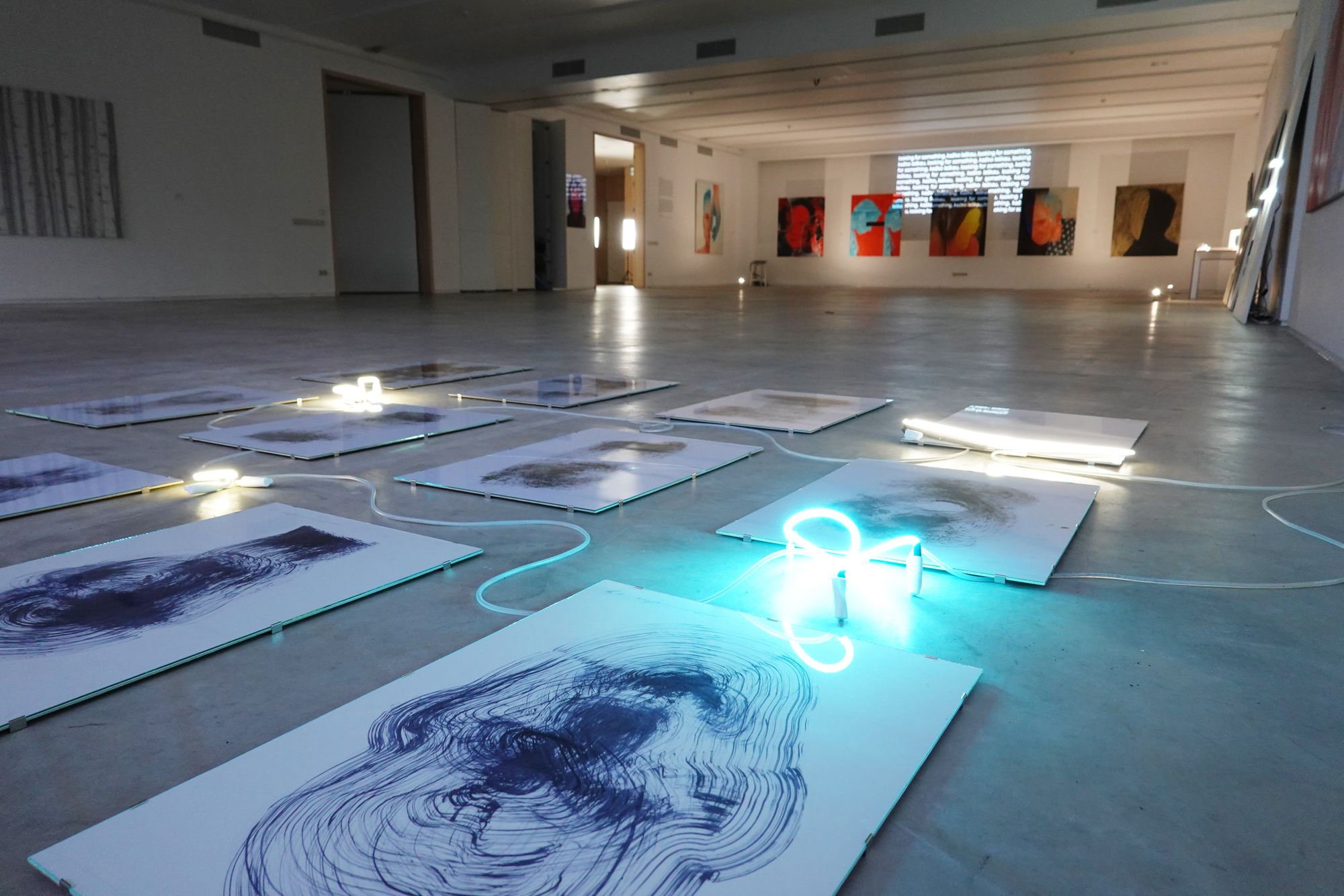 The exhibition features paintings made primarily in oils (as well as with acrylic and spray paints, and neon) that cover the artist’s introspection.