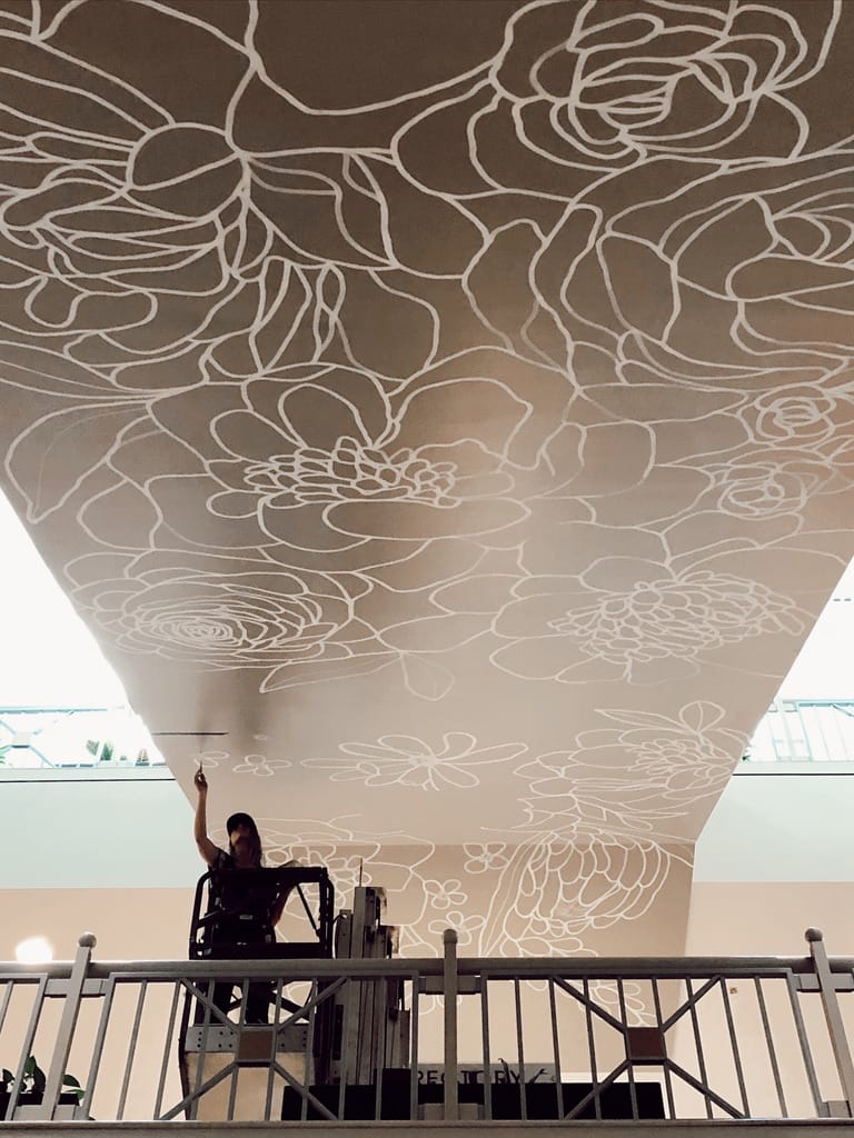 Alli K: My husband is my favorite and most valuable mural asset, so that’s going to be hard to beat. But I would say the two other things I need while painting are my Bose headphones and a good Zebra paintbrush.