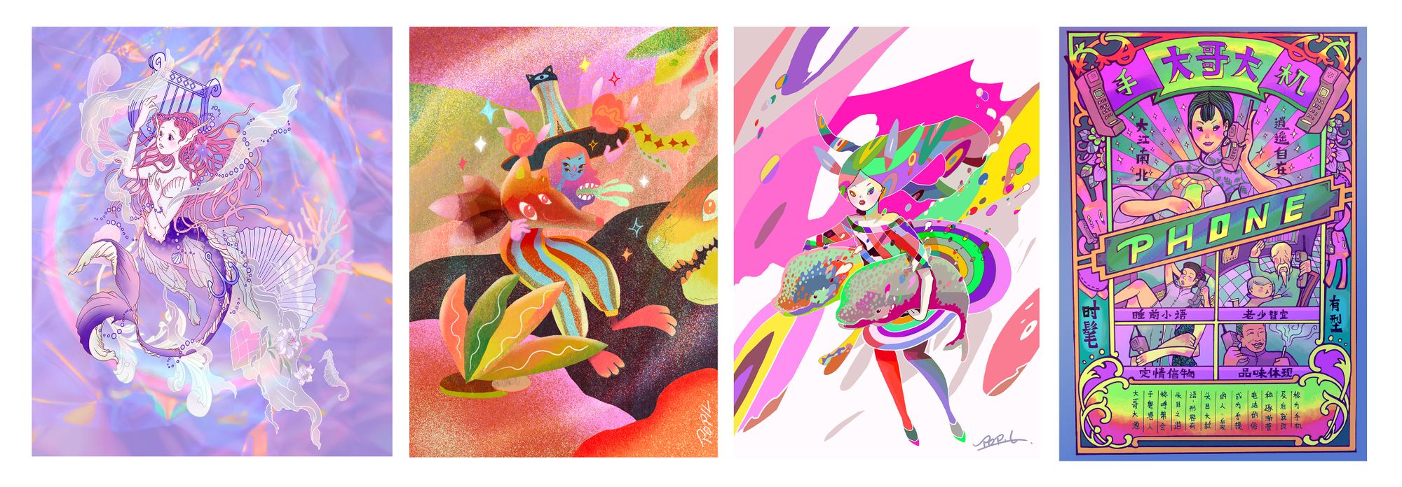 I love eclecticism, playing around with color application and patterns. I usually employ hand drawing and oil painting and remix them with software by adding on AR or 3D effects or animation to liven up the picture.