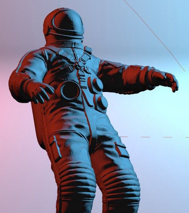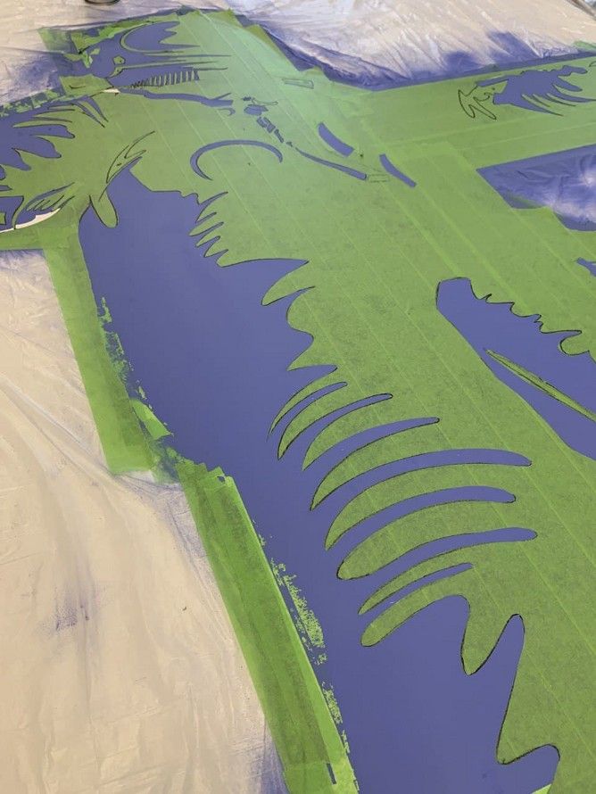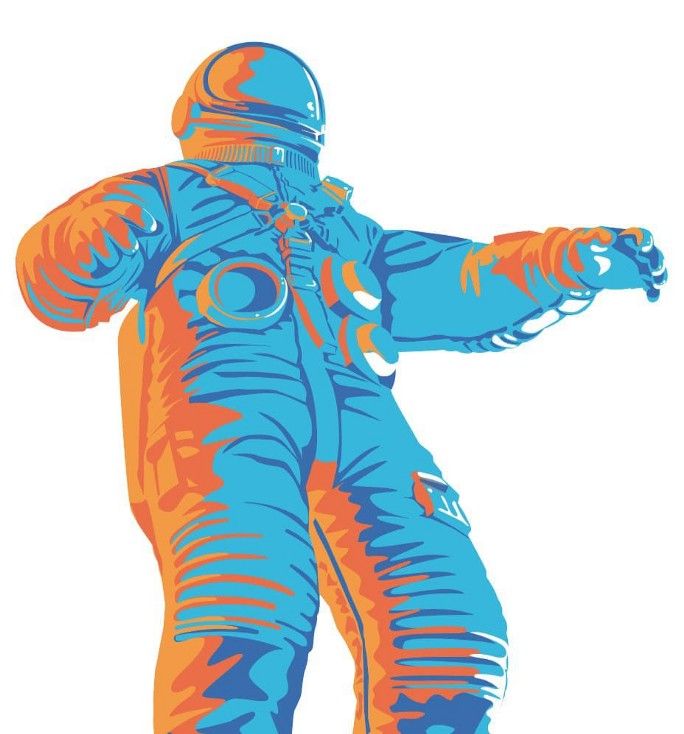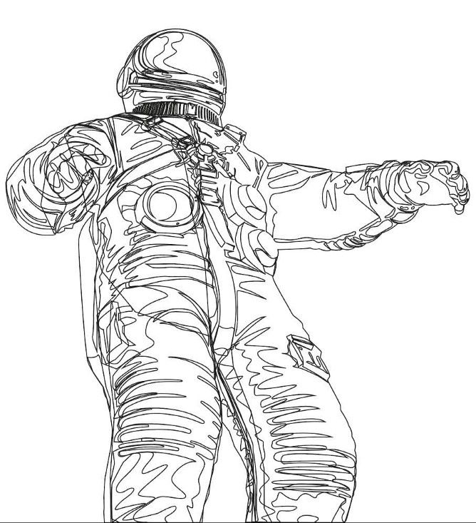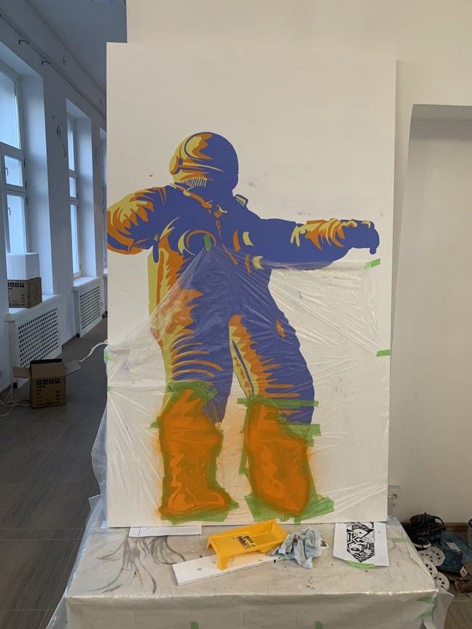 Since the place was originally conceived as a space-themed club, I chose the character of cosmonaut Alexey Leonov as a reference for one of my paintings. I built a 3D scene, created contour lines, dividing them by color, and then transferred each layer to the canvas with the help of SketchAR. I was putting tape around the required outline and was covering it with the color, each of the five separately. Unfortunately, I wasn’t able to capture that process, as the app wasn’t very stable, plus there were no additional shooting accessories close at hand.