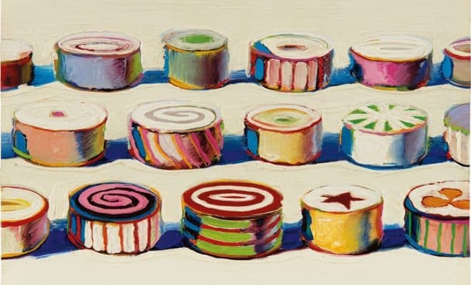 Wayne Thiebaud is an American painter most noted for his colorful still-life works of edible treats and everyday objects: cakes, pie slices, candy pieces, and the twisting streets of San Francisco.
