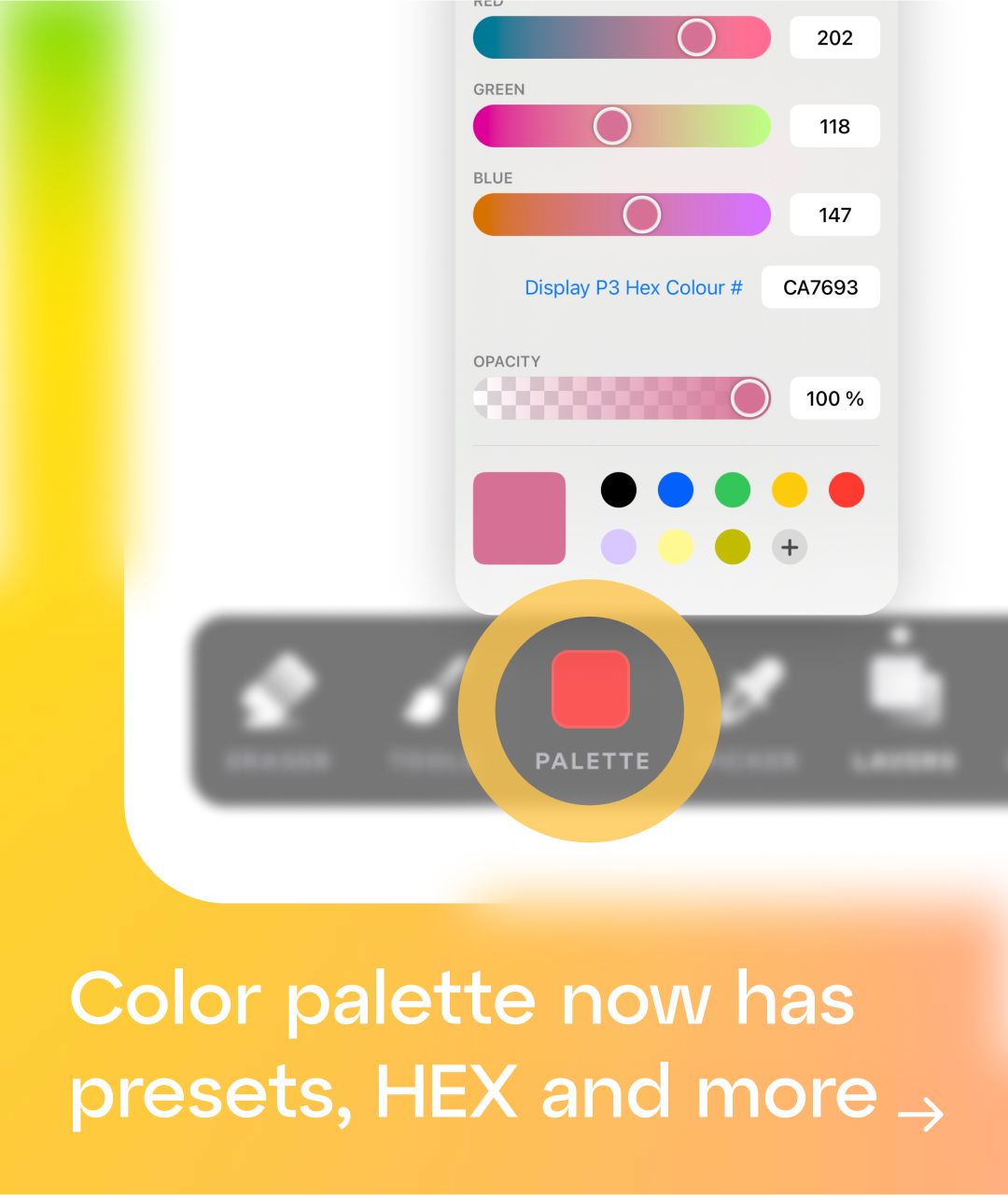 Color selection has never been this accessible. From beginner-friendly presets to HEX inputs for those venturing into specific color choices, the new palette is designed for easy navigation. Plus, with the addition of sliders, anyone can playfully experiment and discover the perfect shade.