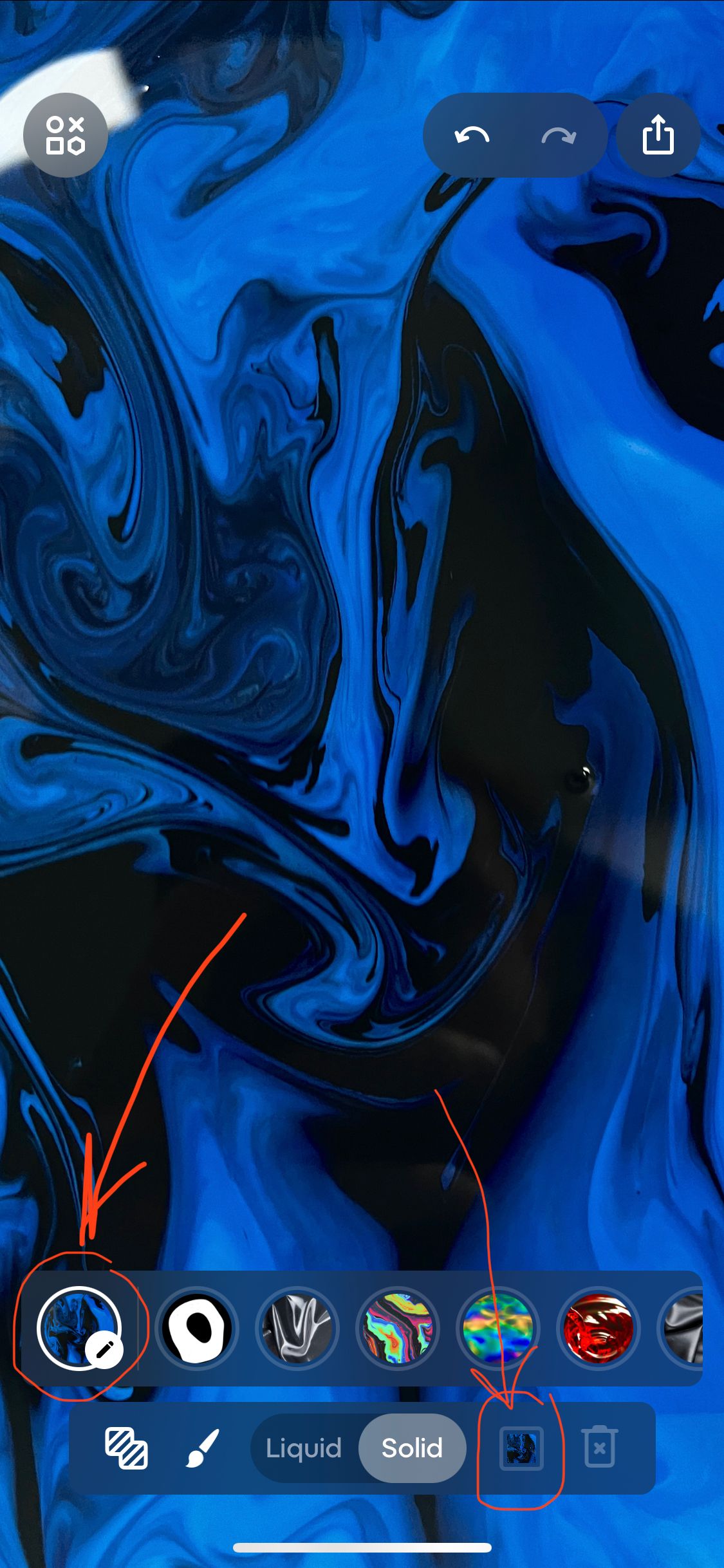 Another important effect is the Liquid mode. In this mode, the brush becomes transparent, but everything that falls under it is distorted, as if viewed through water or glass. Liquid mode can be used as an additional effect with strokes in Solid mode, or on its own to create patterns, as seen in the examples below. As a "life hack", if you draw in Liquid mode and change the background on each stroke, you can achieve an interesting mask effect. We recommend experimenting with this feature.