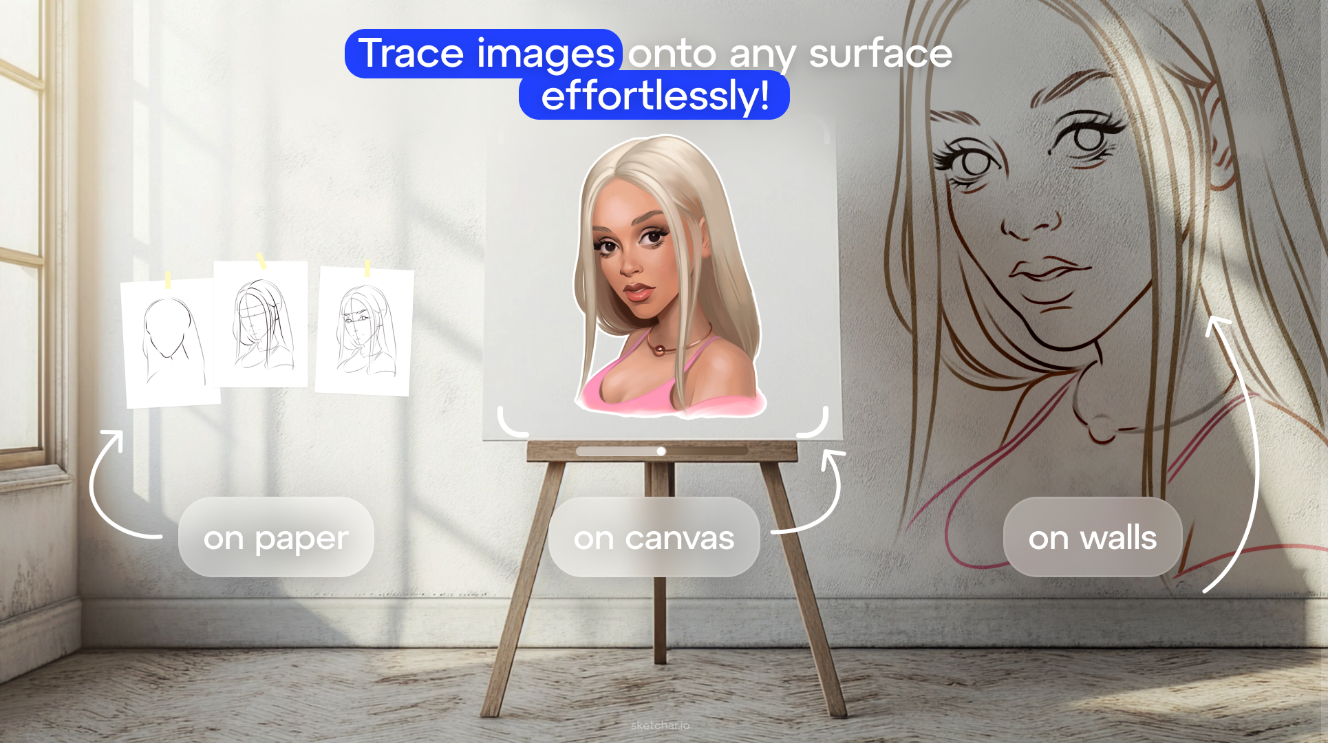 Sketchar for Meta Quest is a magic layer between VR headset and the real world surfaces. Using your Quest headset, you can trace images, sketches, or photos directly onto real surfaces like walls or canvases — all while seeing your guides through the headset.
